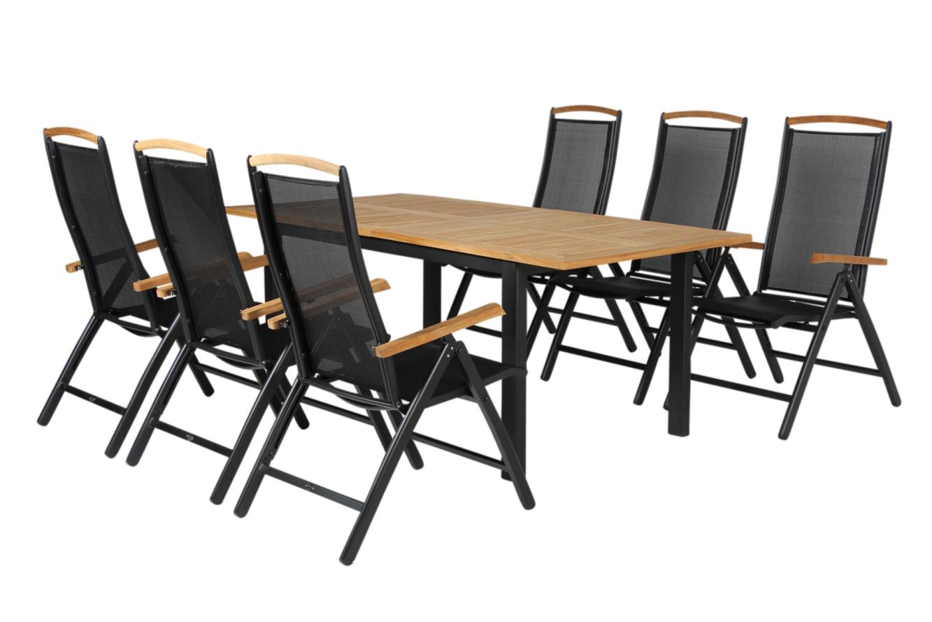 Till gruppen tillhör sex stycken positionsstolar i svart aluminium, textilen och armstöd i teak.