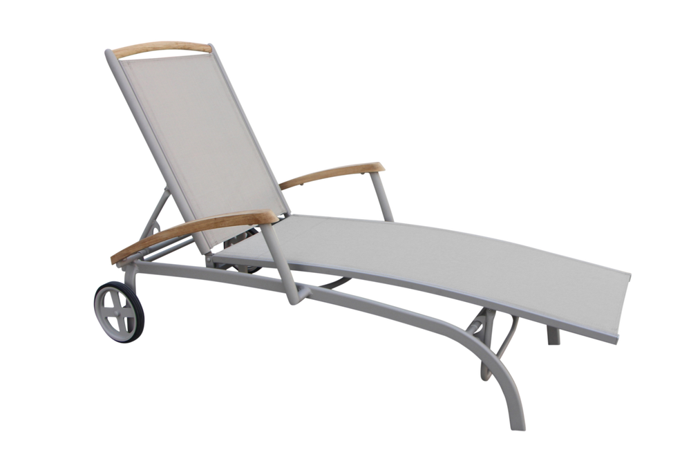 Andy - en av våra absolut mest populära solsängar. Stomme av aluminium samt sits och rygg i textilene, med detaljer i teak eller nonwood. Justerbar rygg med flera olika lägen. Solsängen är även utrustad med hjul för en smidig hantering.