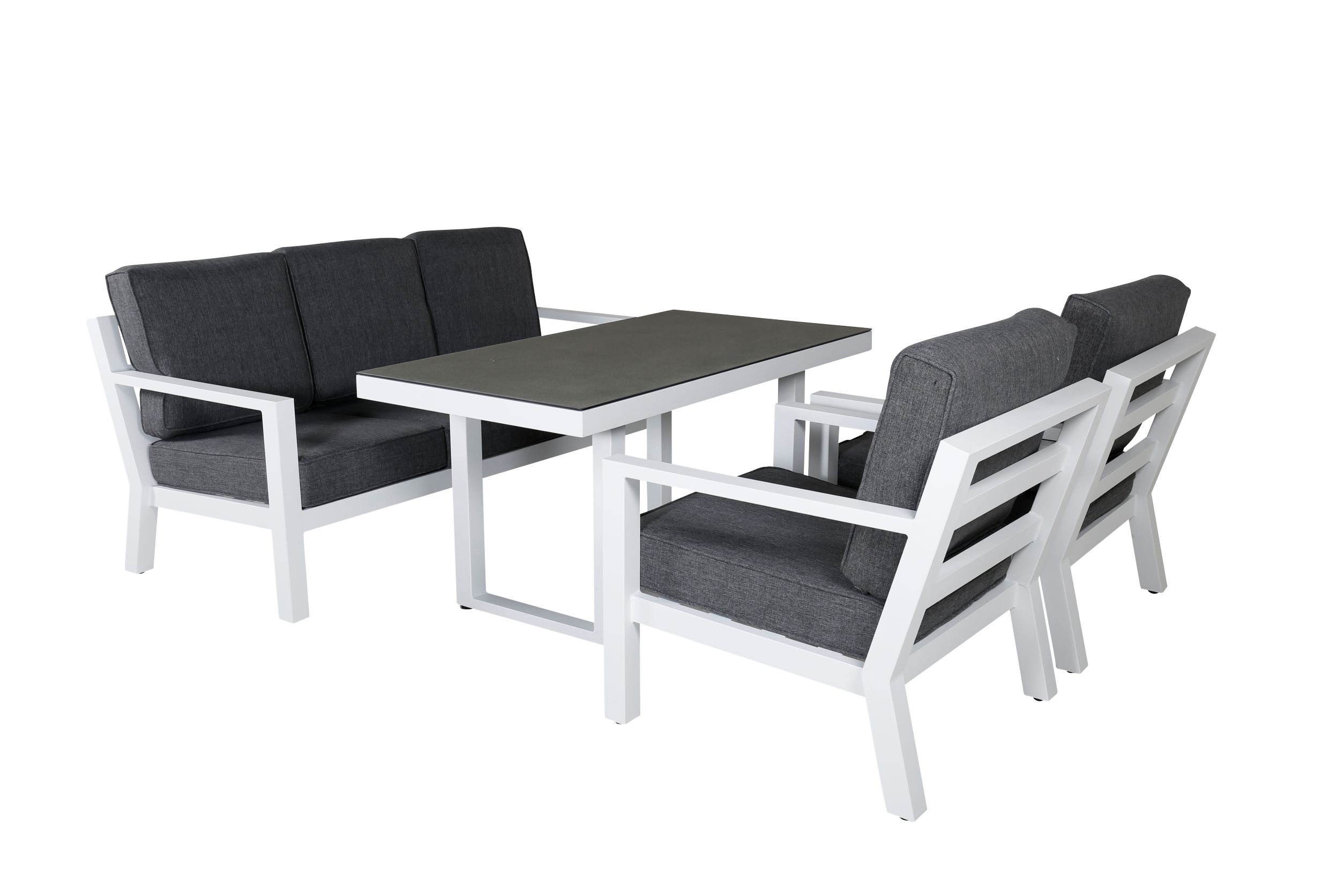 En charmig mittpunkt till uteplatsen i sommar! Barcelona soffgrupp är en skön och snygg grupp i vit aluminium med tillhörande bord med en toppskiva i glas. Stolsbenen är lätt utsvängda i en skandinavisk design och ger ett modernt intryck. Slitstarka dynor i vitt ingår.