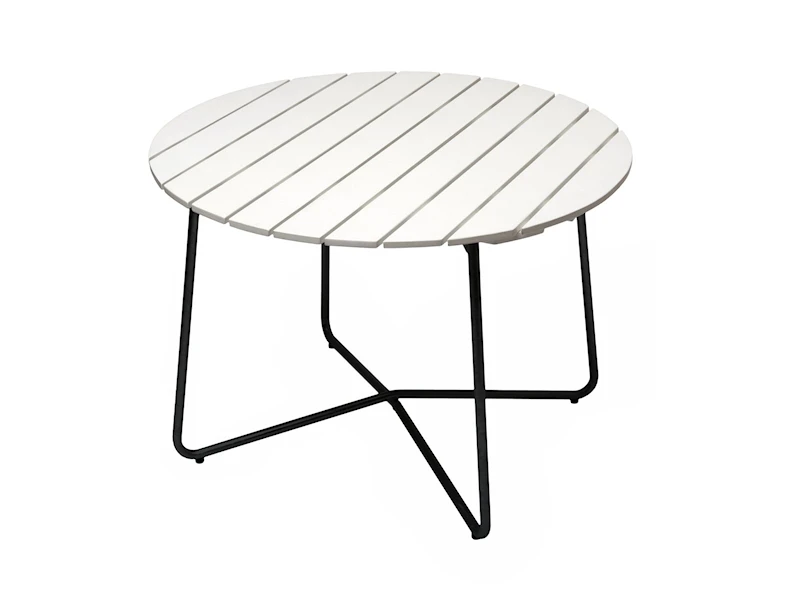 Med vitlackerad ek och ett stilrent svart stativ får detta bord en tidlös och modern look. Den ljusa ytan ger ett fräscht uttryck som passar lika bra i trädgården som på en elegant altan. Stativet i svartlackerat stål ger en stabil och hållbar konstruktion.