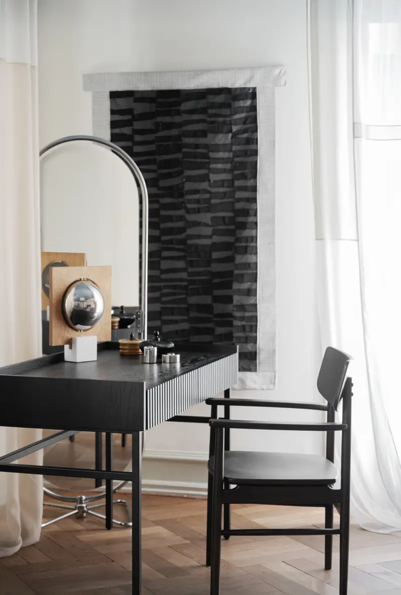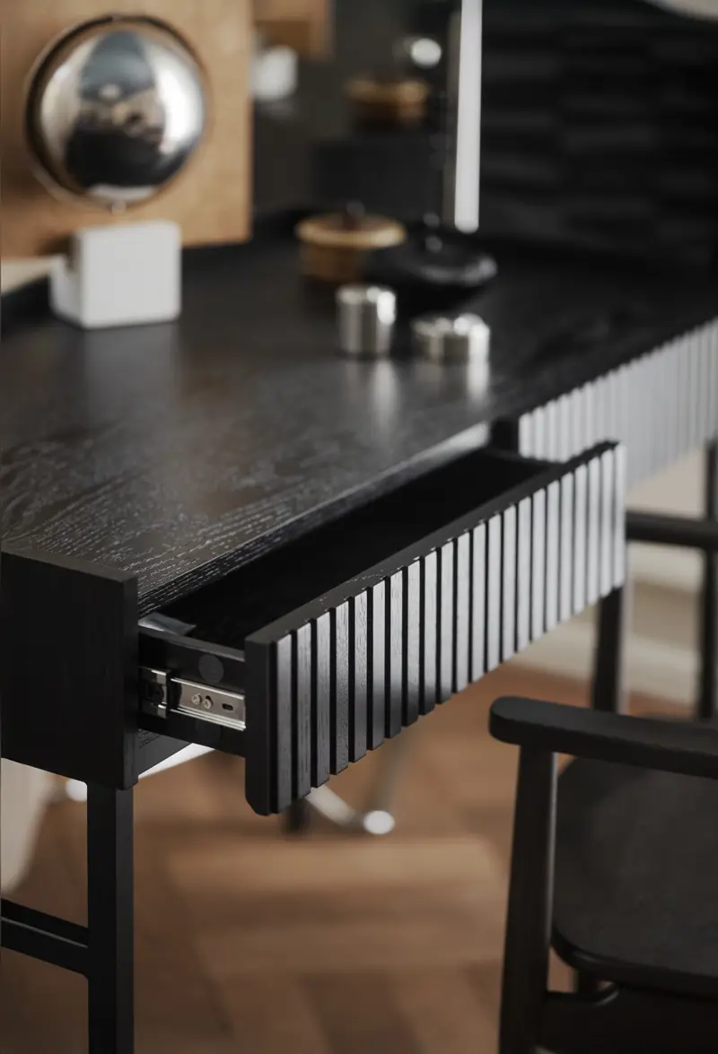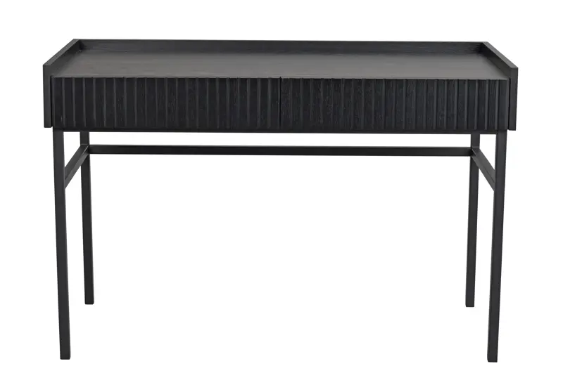 Halifax skrivbord passar perfekt till det stilrena hemmakontoret eller som sminkbord i sovrummet. I skrivbordet finns två utdragbara lådor med dolda hål förberett där du själv väljer om du vill montera de medföljande guldfärgade knopparna i borstad metall. Skrivbordet har även en praktisk sarg runt bakre delen av bordskivan som skapar avskildhet och skydd åt papper och annat. Kombinera gärna Halifax skrivbord med förvaring i samma serie för ett elegant helhetsintryck.