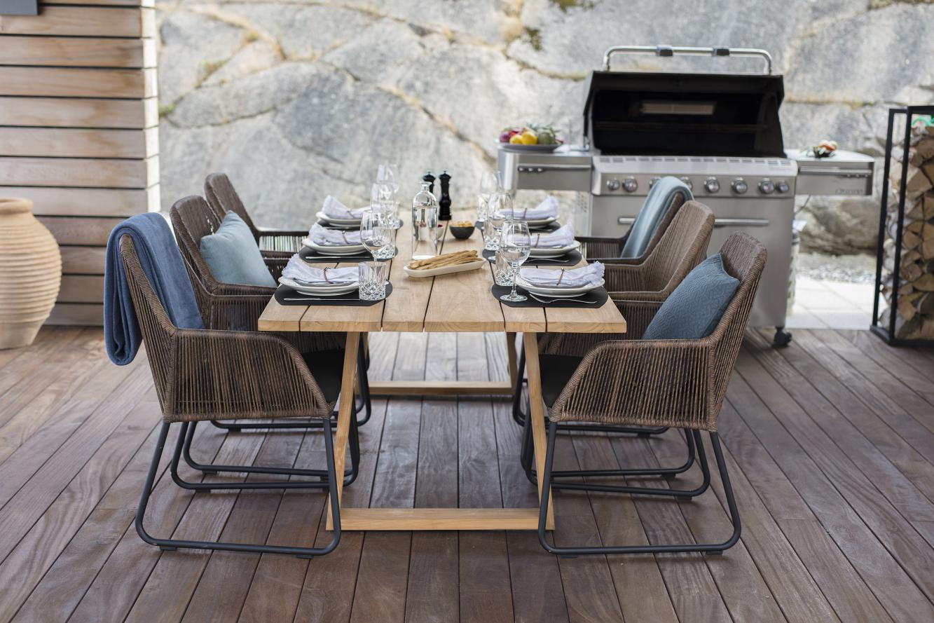 Laurion - är ett vackert modernt teakbord präglat av en bordstopp i unik design och ett skickligt hantverk. Ett lättplacerat och generöst matbord som här visas tillsammans med karmstolen Midway.