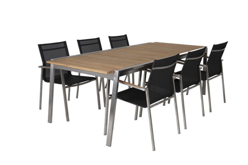 Rena linjer och tidlös design i en modern tappning. Blandningen av material är spännande: rostfritt stål (316) och teakdetaljer på armstöden och bordsskivan.