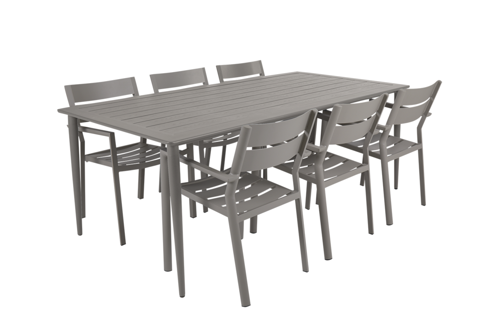 I denna matgrupp ingår ett Nimes bord samt sex stycken Delia karmstolar .