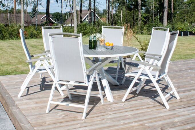Stolarna är fällbara med bra komfort– här sitter du gärna kvar länge och njuter av sommarens härliga stunder!