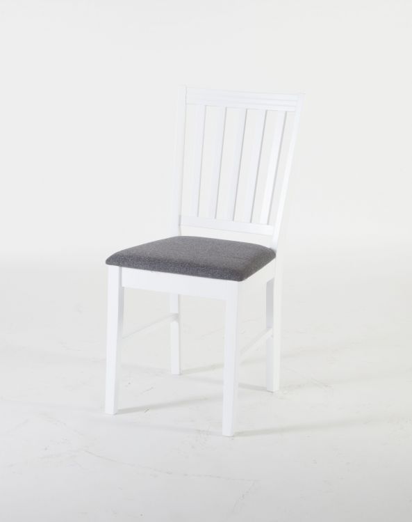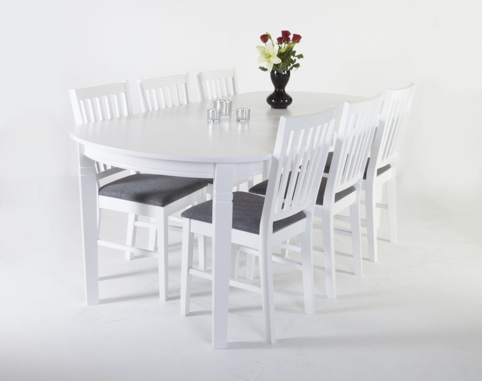 Sandhamn matgrupp 160/200 x 95 cm med 6 st stolar. Sitsen i stolarna är klädda med grå textil. Detta vackra matbord är förlängningsbart till 200 cm (iläggsskivan ingår).