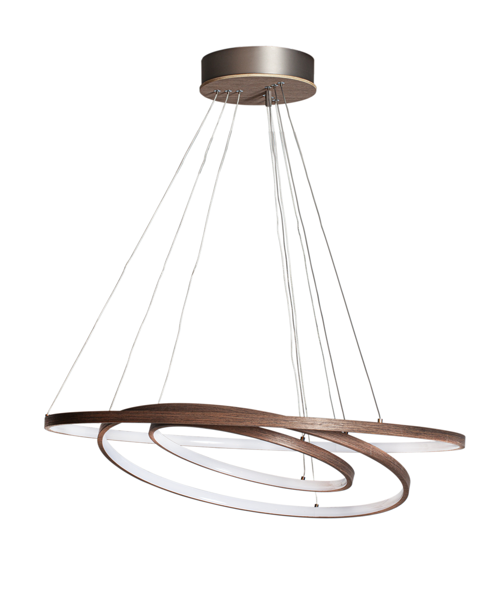 Upplev Trione, vår exklusiva taklampa som kombinerar elegans och anpassbarhet. Med tre justerbara FSC-certifierade träringar och integrerad LED skapar den en belysningsupplevelse. Varje ring (80 cm, 60 cm, och 40 cm i diameter) kan enkelt justeras i höjd och placering med lampans vajerfästen. Takkoppen är i matt nickel och kabeln är transparent. Skapa ditt eget ljusspel och förvandla ditt hem med Trione.