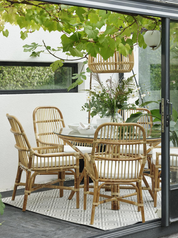 Vallda är en serie med stolar, bord, hänggunga och lampskärm i naturrotting med fina detaljer. Naturrotting är flätad rotting där skalet har behållits vilket ger en mer naturlig färg och naturliga oregelbundenheter. Möbler i naturrotting bör placeras under tak.