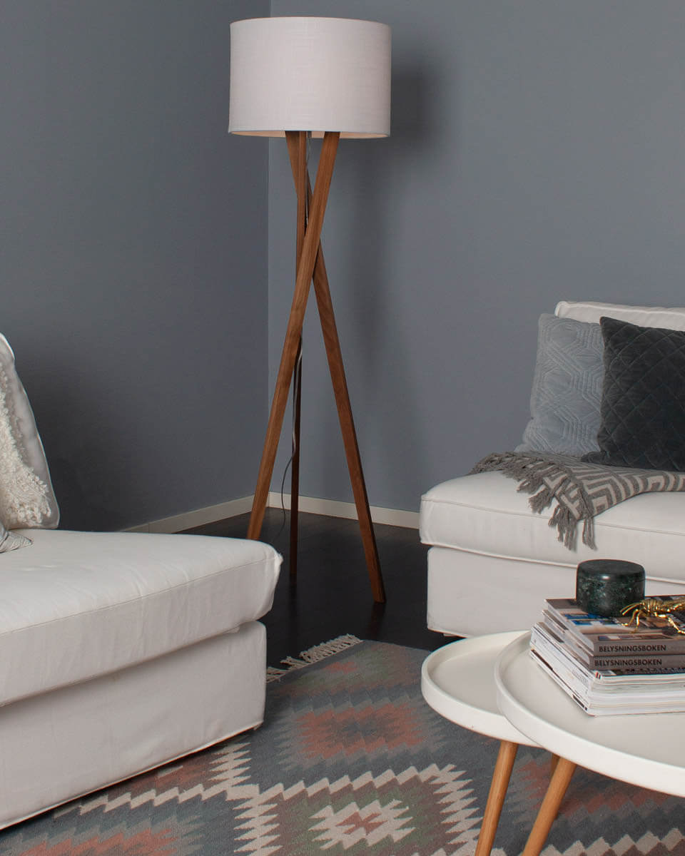 Golvlampa Vega är en massiv lampa på 160 centimeter som finns i äkta ek och äkta valnöt. De korslagda tre benen skapar en snygg twist på den annars stilrena lampan. På toppen av lampan ser vi en vacker skärm i vitt som förstärker enkelheten i denna vackra golvlampa.