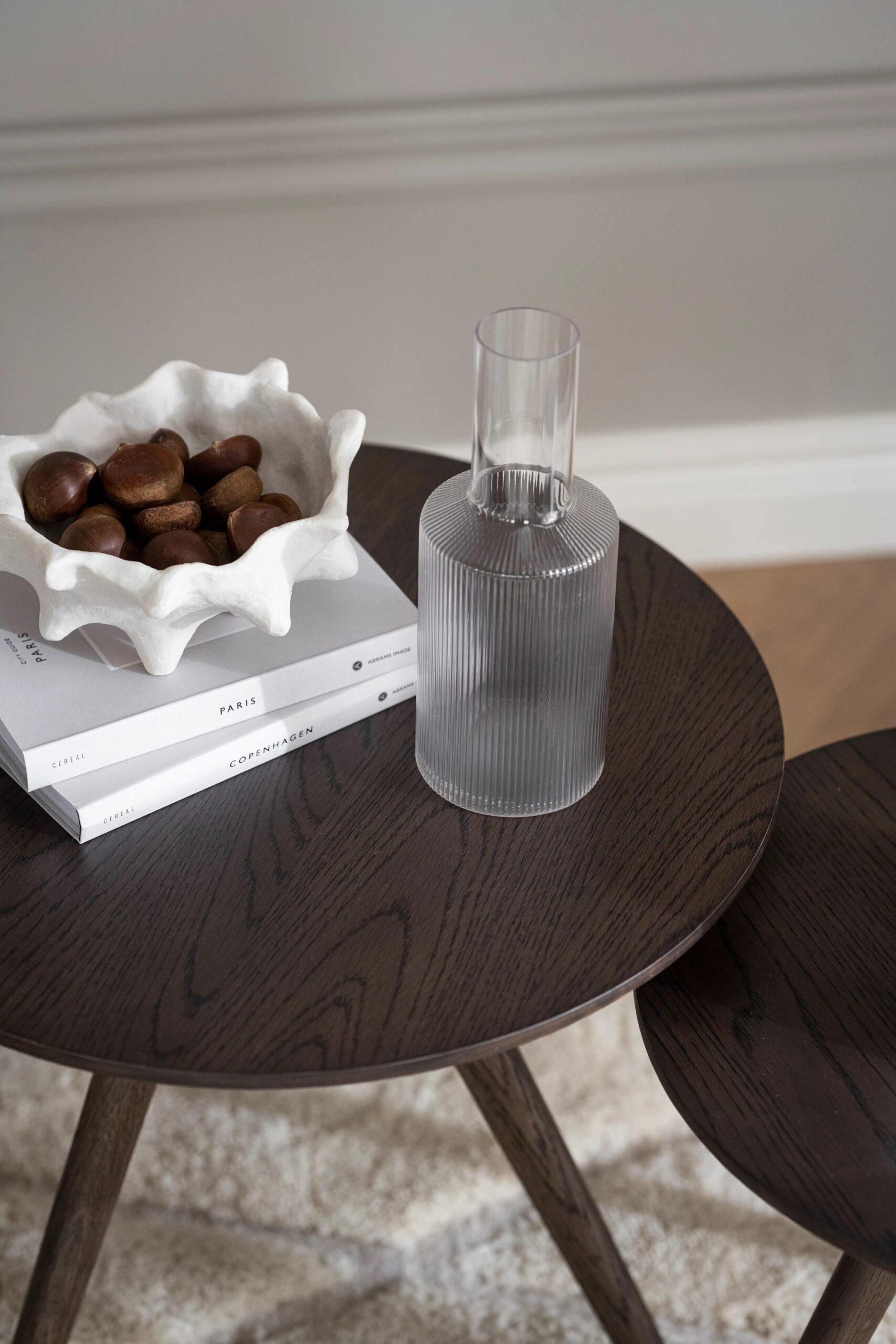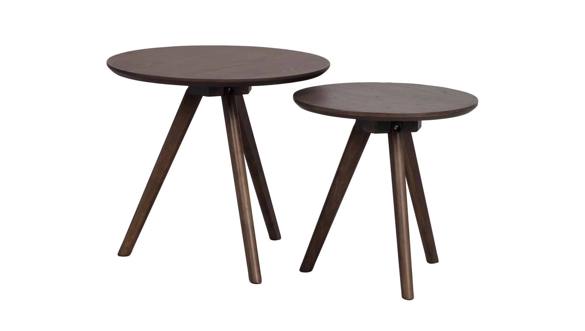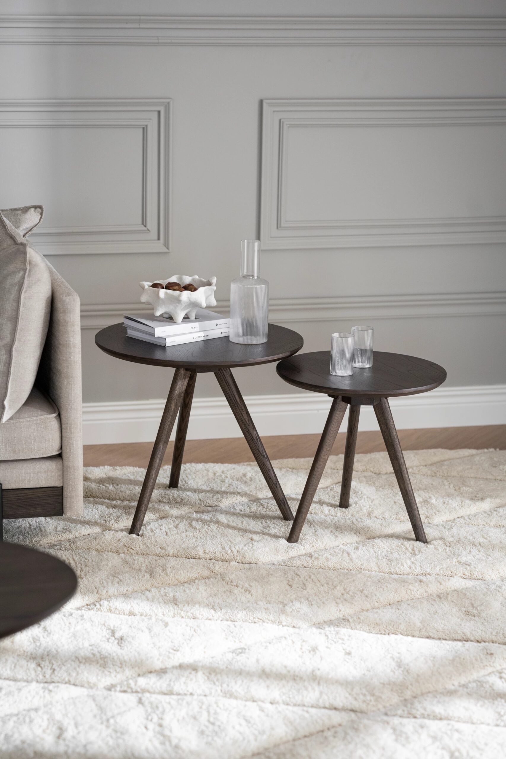 Yumi satsbord är ett set med två bord i tidlös skandinavisk design som håller år efter år. De flexibla satsborden sparar plats och är lätta att flytta runt vid behov. Använd dem tillsammans som soffbord eller enskilt som sidobord. Bordsskivorna består av brunlackad askfaner. Stora bordet; Ø 50 cm, höjd 45 cm, lilla bordet; Ø 40 cm, höjd 40 cm. Kombinera gärna med andra möbler i serien Yumi.