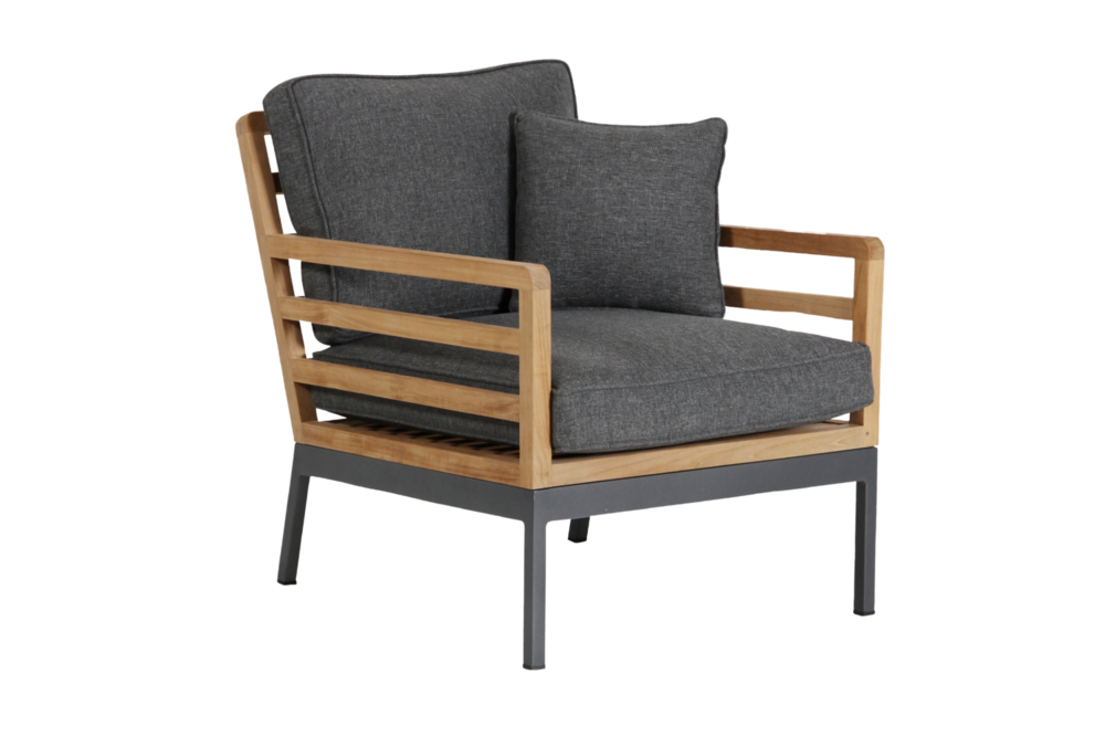 En mycket elegant grupp där kvalitetsteak kombineras med benställningar i antracitlackerad aluminium. De tvärställda teakribborna höjer intrycket av kvalitet och elegans. Till soffan hör två prydnadskuddar och till fåtöljerna en kudde.